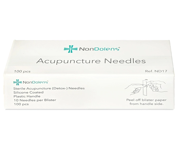 Cada envase contiene 100 agujas auriculares NonDolens ND17, presentadas en 10 blísters. Cada blíster incluye 2 tiras de 5 agujas, lo que facilita la organización y preparación del material en consulta.