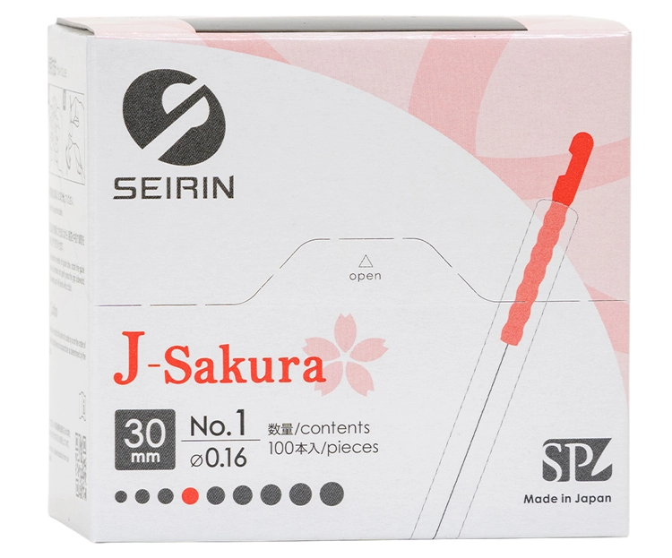 Cada envase contiene 100 agujas de acupuntura desechables Seirin SE23 J-Type, de acero especial inoxidable, siliconadas, con mango de plástico J-Type y tubo guía incluido.
