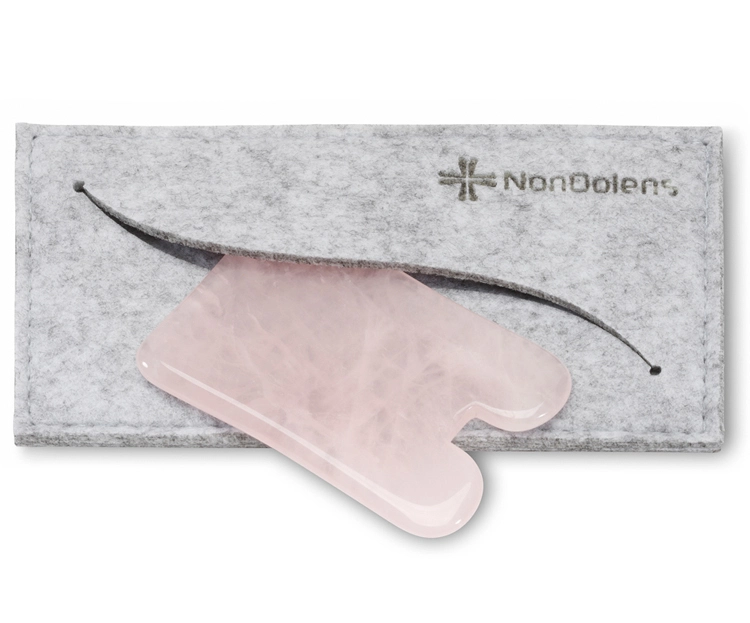 Incluye 1 Gua Sha de cuarzo rosa en forma de U, modelo NonDolens ND250-R, suministrada en una funda protectora de fieltro para guardarla y transportarla con mayor comodidad.