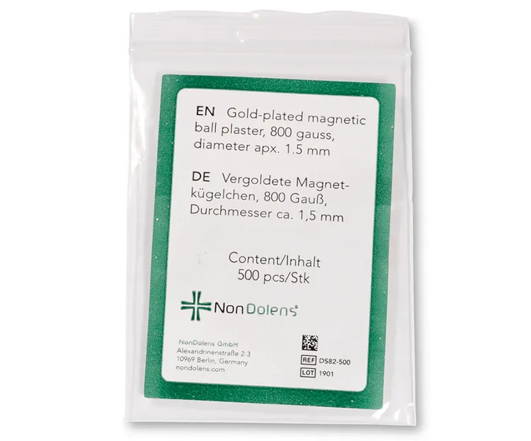 Imanes terapéuticos en forma de pequeñas esferas, con recubrimiento dorado y una intensidad de 800 Gauss. Cada bolita tiene un diámetro aproximado de 1,5 mm.