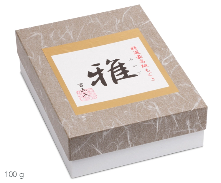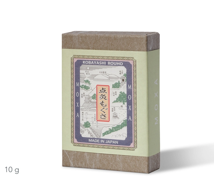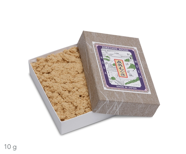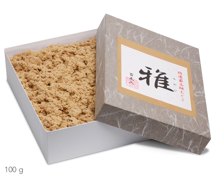 | Otros detalles | Grado de pureza 5 estrellas (Tenkyuyo Miyabi). Según la clasificación del grado de pureza, un grado más alto se asocia a aroma más fino, calor de combustión más bajo, duración más breve de la combustión y alcance más rápido de la temperatura ideal. La empresa familiar Kobayashi-rouho produce moxa desde 1780. |