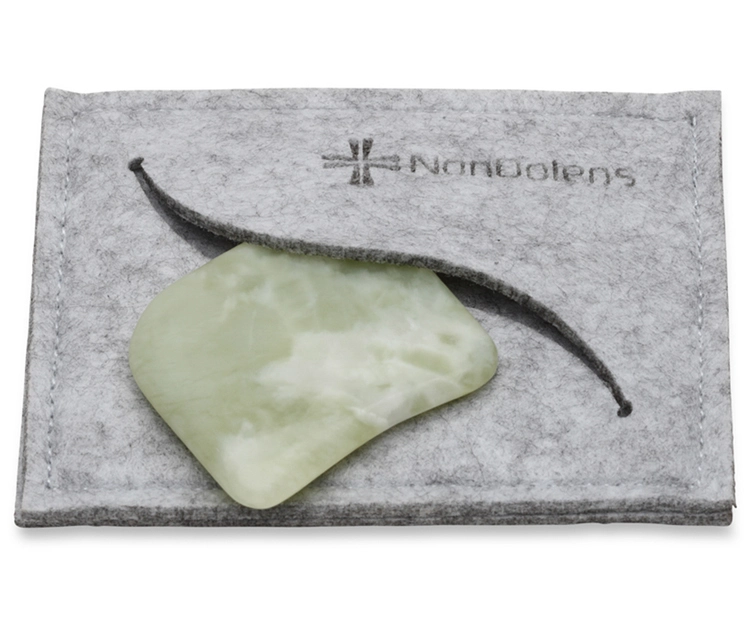 Trabajamos con una pieza de jade verde de Xiuyan (serpentina), tallada a mano, por lo que cada herramienta es única en color y vetas. Un accesorio práctico y manejable para tus tratamientos en cabina y protocolos de trabajo diario.